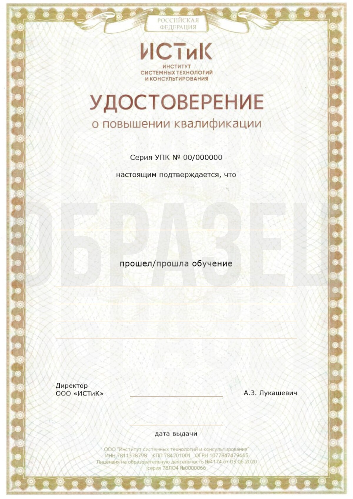 По итогам успешного прохождения обучения, вы получите Удостоверение о повышении квалификации установленного в ИСТиК образца.
